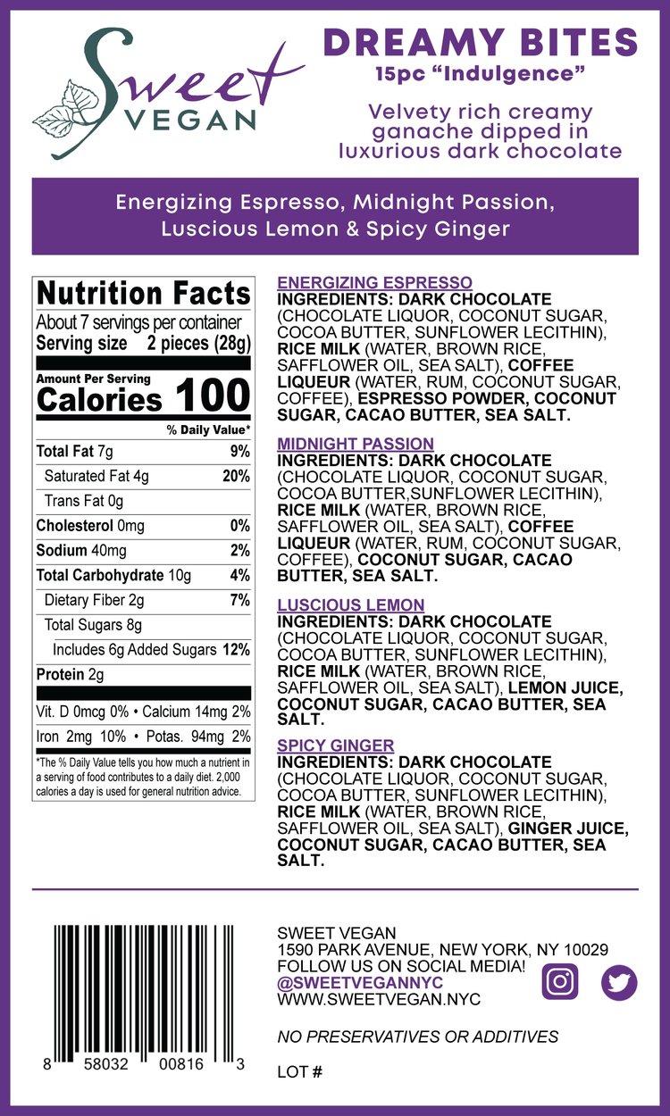 Ingredients: dark chocolate, rice milk, coconut sugar, cacao butter, espresso, coffee liqueur, sea salt