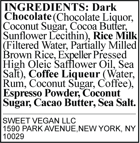 dark chocolate, rice milk, coconut sugar, cacao butter, coffee liqueur, sea salt