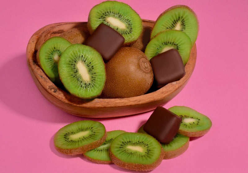 Ingredients: dark chocolate, rice milk, coconut sugar, cacao butter, kiwi, sea salt
