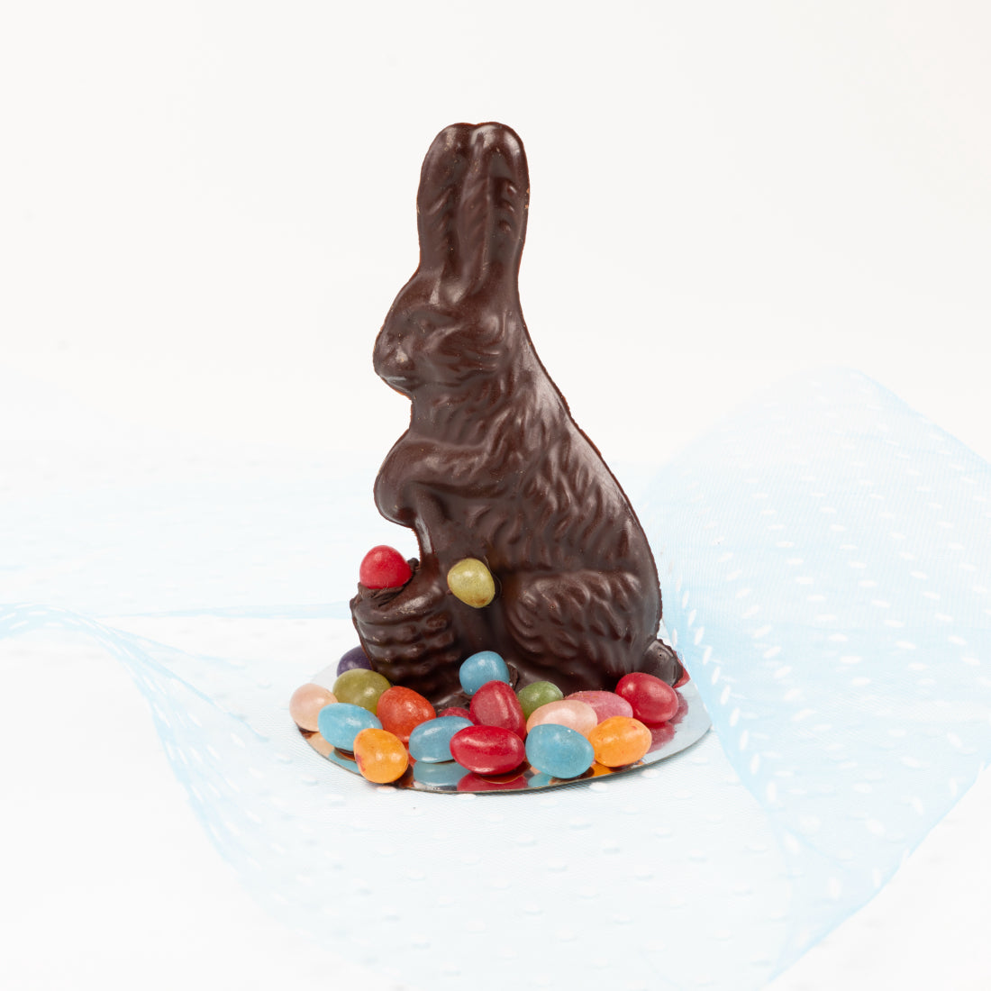 “Beau” Bunny is a solid 70% vegan dark chocolate bunny, decorated with fruit juice-sweetened organic jelly beans. Freshly made and beautifully packaged just for you!Weight: 4.4 oz